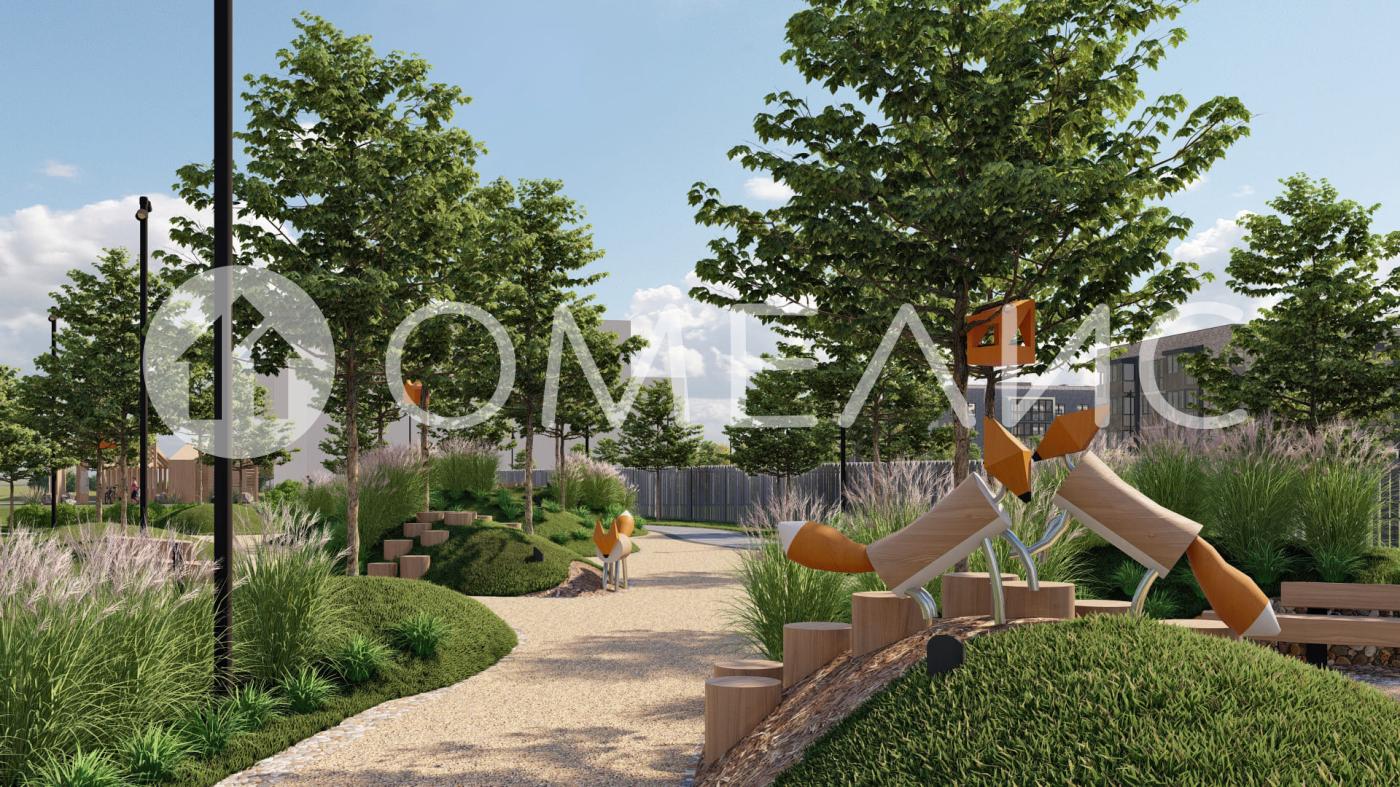 Территория выполнена в виде сенсорных садов, отражающих времена года с соответствующей растительностью. В центре расположен парк с различными зонами: центральная площадь, пруд с набережной, игровые площадки для детей, йога-парки, экотропа, спортивный хаб, скейтпарк, памптрек, велодорожки.