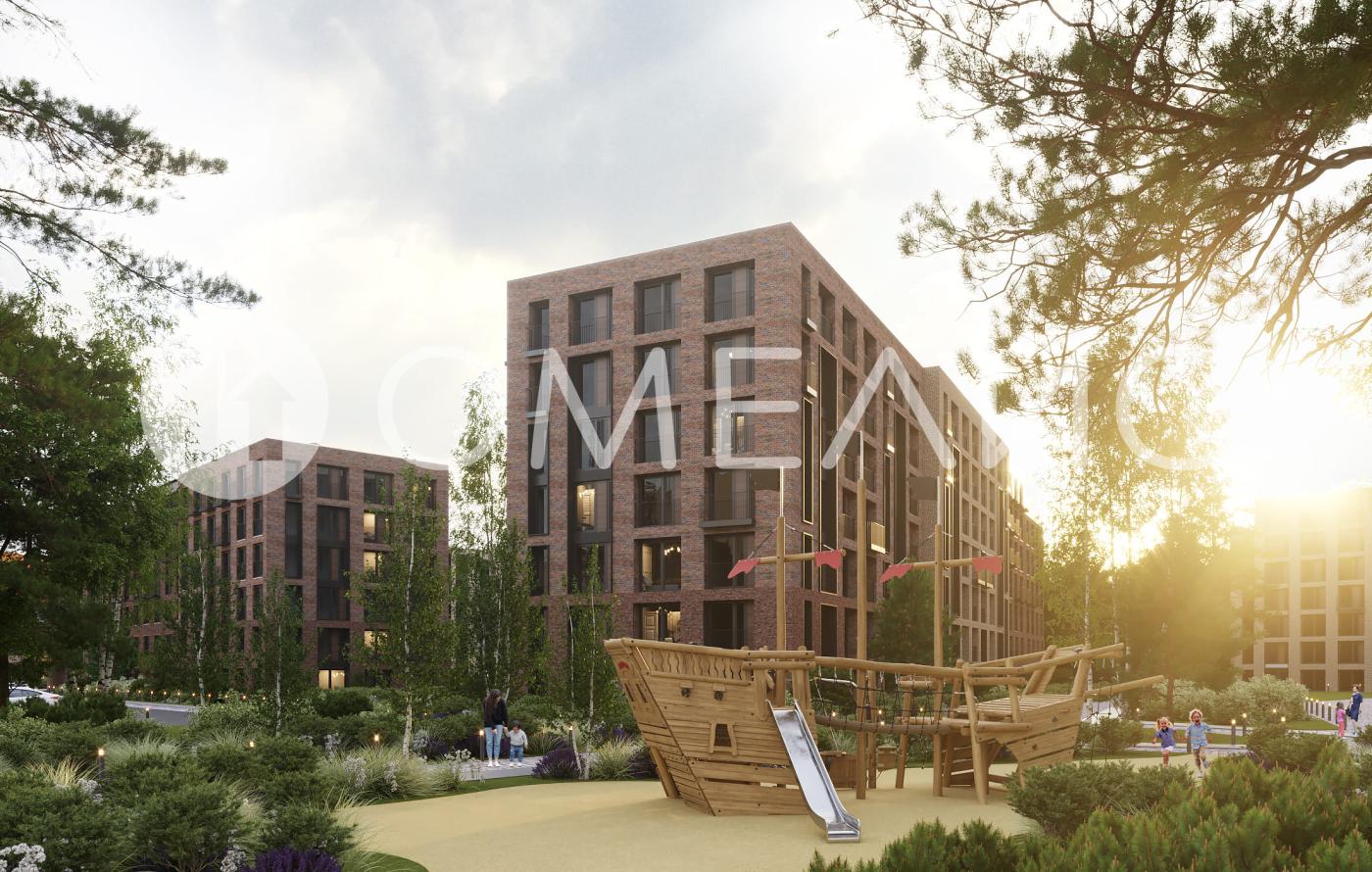 Экстерьер выполнен в английском промышленном стиле: фасады из керамического кирпича подчёркивают строгость и историю. Обилие стекла, вертикальные балки и арочные конструкции создают гармоничный современный облик.