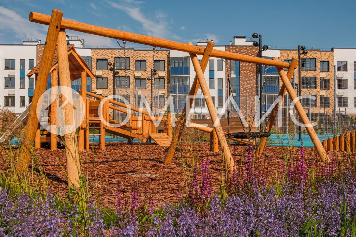 Дома квартала образуют 4 урбан-блока без машин. Приватные пространства выполнены в виде сенсорных садов с обилием зелени и продуманным ландшафтным дизайном. Архитекторы спроектировали релакс-зоны с беседками, воркаут и спортивные зоны, детские площадки из природных материалов. Между собой урбан-блоки объединит бульвар для неспешного променада, выходящий на набережную.
