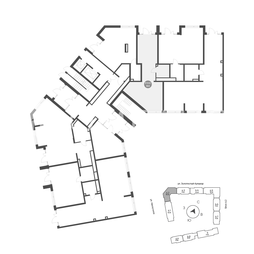 Продается помещение свободного назначения 12, по адресу Свердловская область, г. Екатеринбург, Золотистый бульвар, 18, корпус Солнечный, блок 6.4- встроенные помещения в Солнечный на 1 этаже, с площадью 53.5 м2.